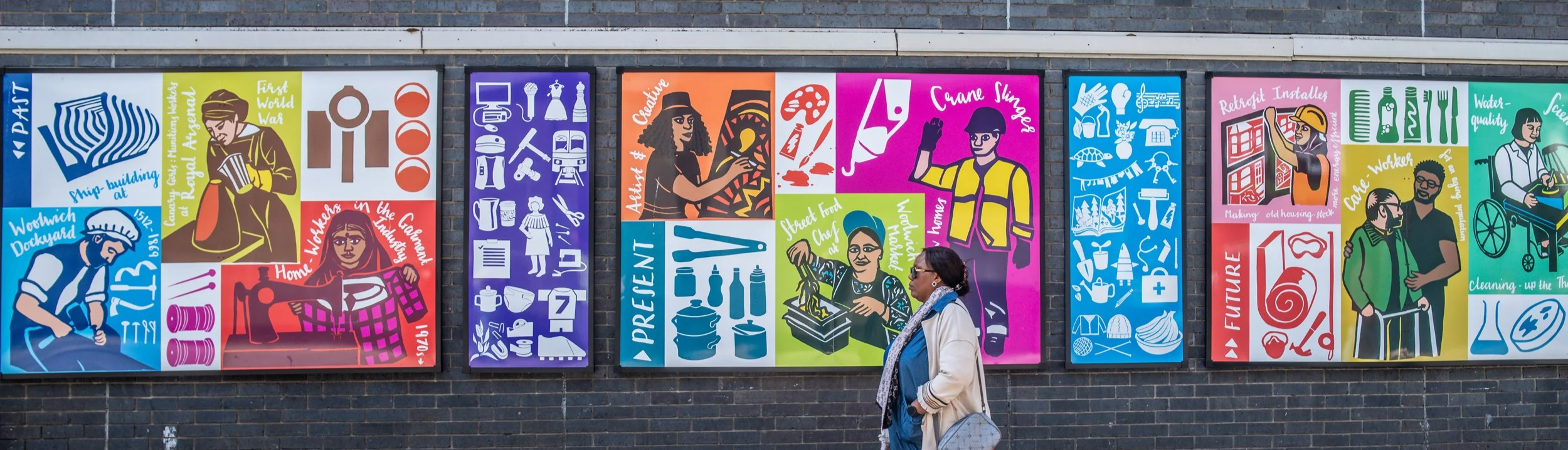 Top: ‘Work in Woolwich: Past Present and Future’ mural co-created with local people. The mural is on Calderwood Street, Woolwich.